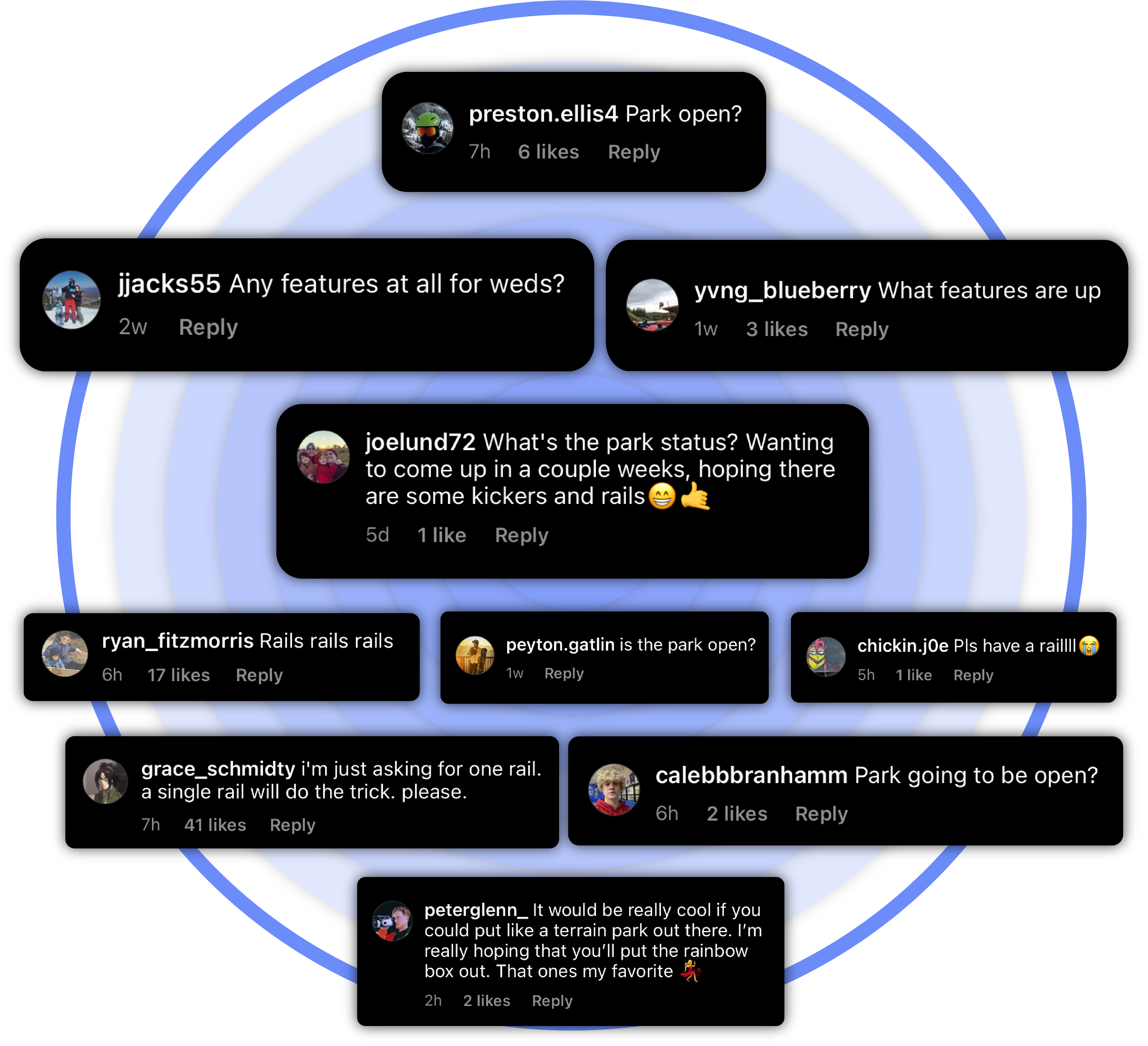 Keep guests stoked and informed. Embed real-time park maps into your website, share on social media, or power your custom reporting with the Ullr API. Update automatically as you do your documentation.